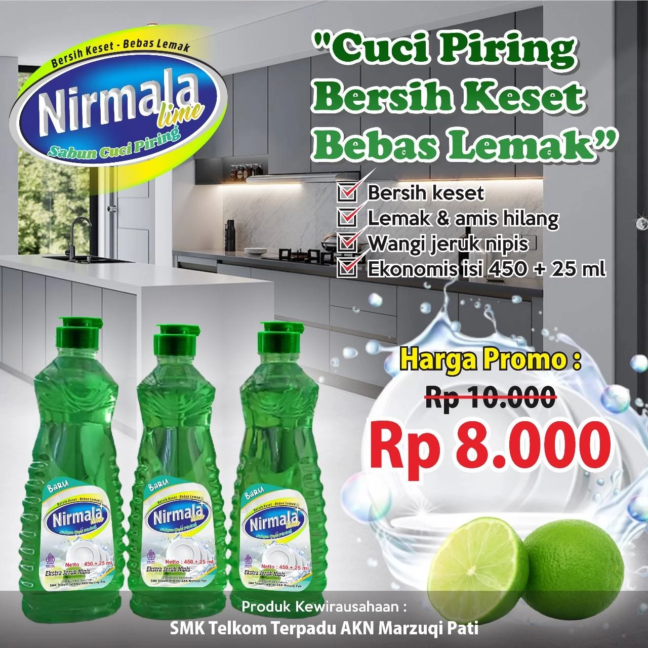 Sabun Cuci Piring Nirmala 450 ml adalah sabun piring berkualitas dengan daya bersih tinggi, hasil kesat, busa melimpah, dan harga grosir terjangkau di Pati. Cocok untuk rumah tangga, warung makan, UMKM, katering, dan reseller. Melayani seluruh kecamatan Kabupaten Pati dengan pengiriman cepat dan stok ready.